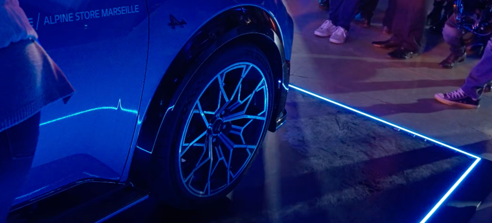 Pensée pour offrir une mise en scène spectaculaire, la plateforme illumine le véhicule avec un contour LED intégré, créant un effet visuel saisissant. Ce dispositif permet non seulement d’attirer l’attention sur la voiture, mais aussi d’accentuer ses lignes dynamiques, en parfaite harmonie avec l’ADN sportif et innovant d’Alpine.