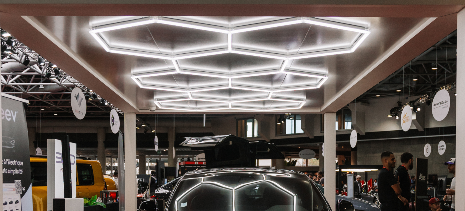 Cet éclairage hexagonal est parfait pour les clients recherchant à combiner fonctionnalité et esthétique sous leur carport, tout en valorisant leurs véhicules même la nuit.