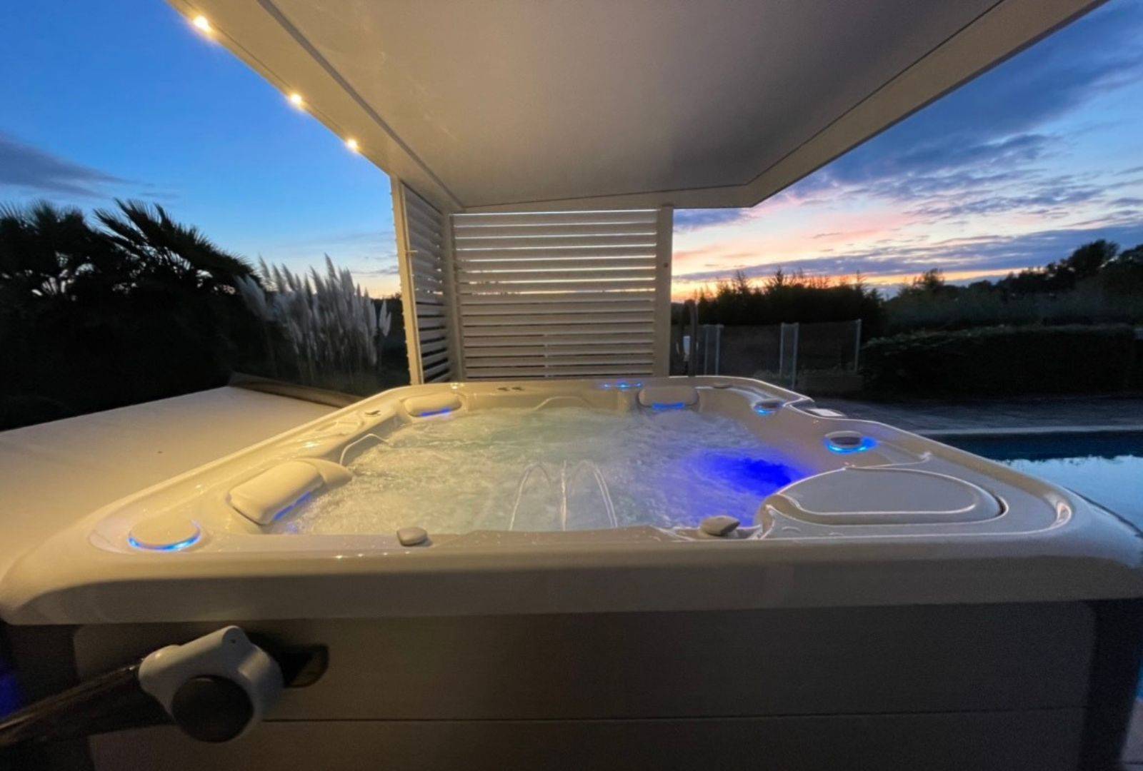 Son toit plat et plein est non seulement esthétique, mais aussi fonctionnel : il protège le spa des feuilles, de la pluie et des autres éléments qui pourraient altérer la qualité.
