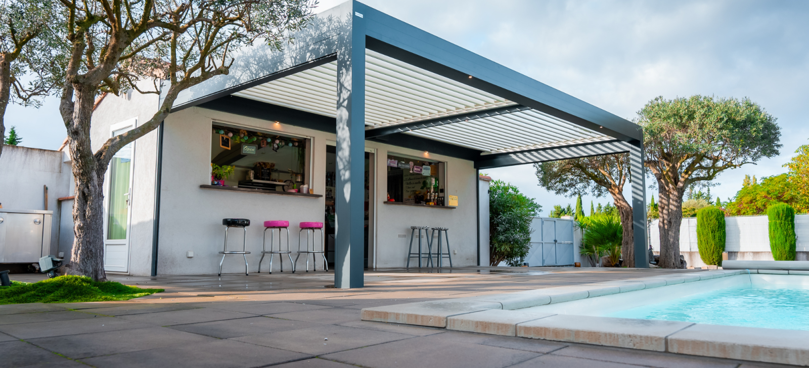 Pour profiter pleinement de sa terrasse et en faire un véritable espace de vie toute l'année, il a choisi une pergola bioclimatique de 6 mètres de large sur 4 mètres de profondeur, une taille idéale pour couvrir l’ensemble de son coin repas et détente.