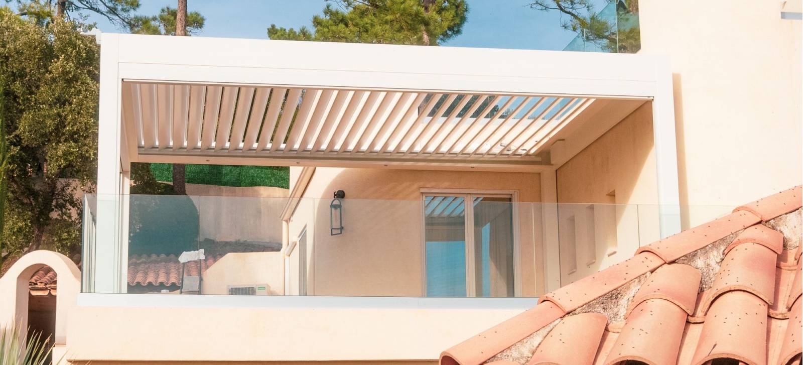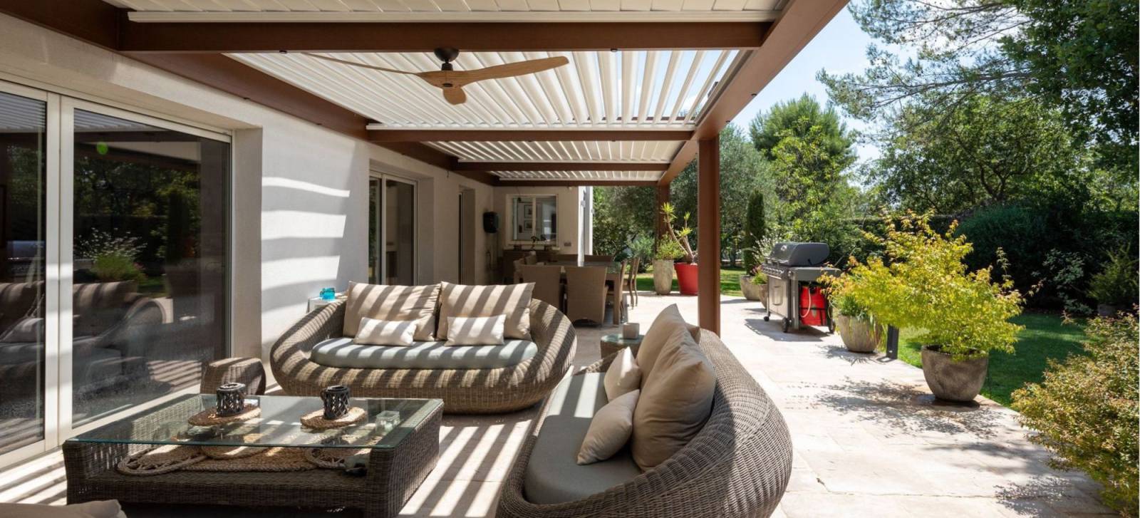 Il s’agit en réalité d’une pergola bioclimatique en aluminium, équipée de lames orientables motorisées qui permettent de gérer l’apport de lumière, la ventilation et la protection contre la chaleur.